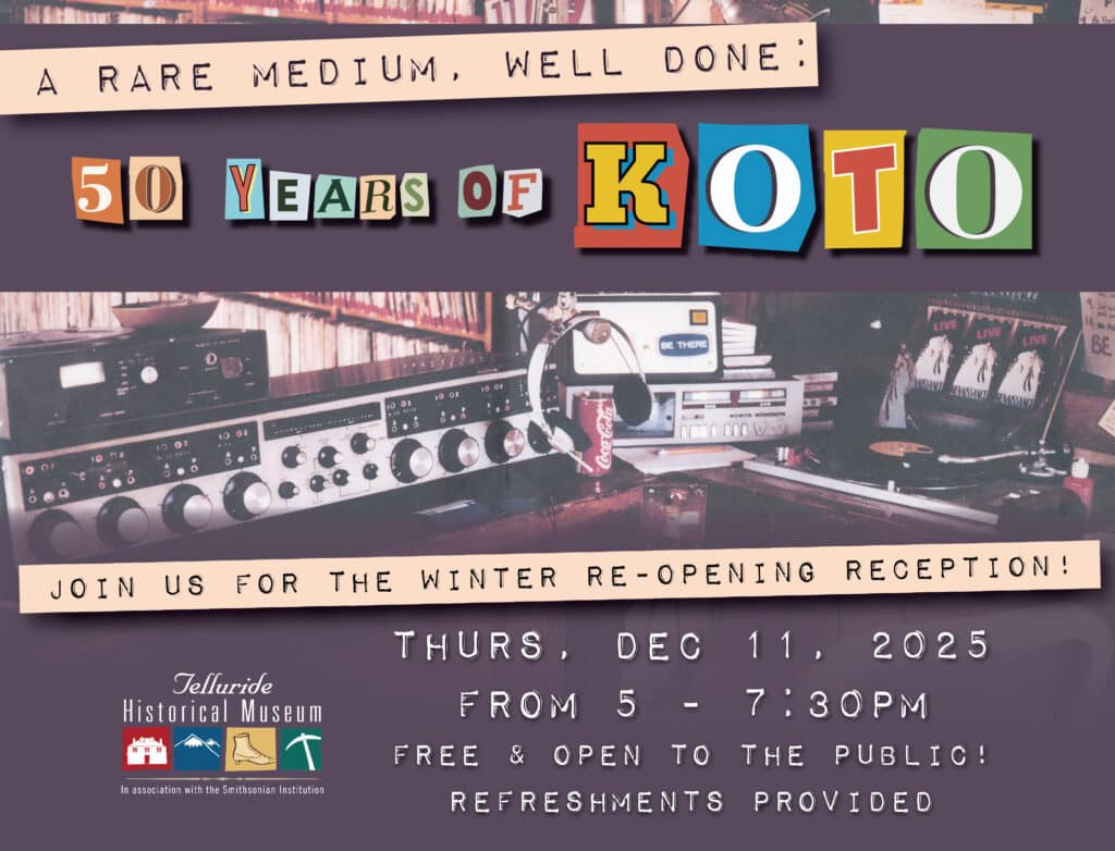 “A Rare Medium, Well-Done: 50 Years of KOTO-FM” will be on display at the Telluride Historical Museum from June 12th, 2025, through the close of the 2026 winter season (early April 2026).
